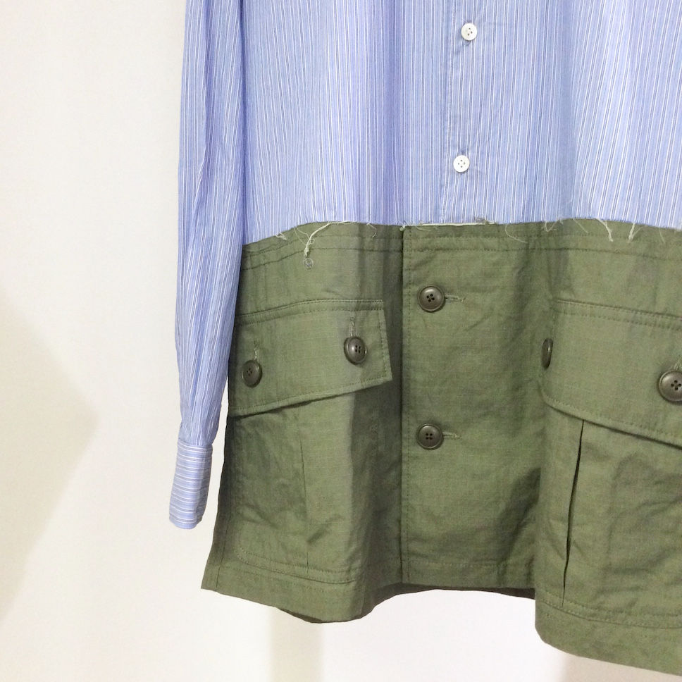 「Army Hem Shirts」は、クラシックなストライプ生地のレギュラーシャツに、M-65の裾部分がドッキングされたデザイナーFさんの得意とするニュアンスが入ったアイテム。